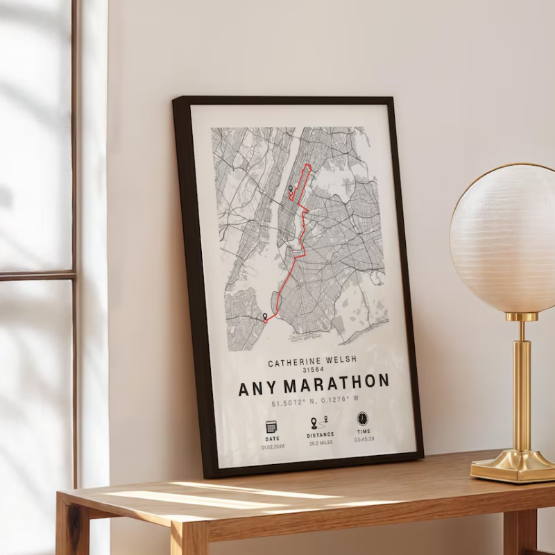 Indulge in the pride of your marathon finish by displaying your personalised map in your home, office, or workout space. With its elegant design and customizable details, it’s a timeless keepsake that celebrates your dedication, perseverance, and success.